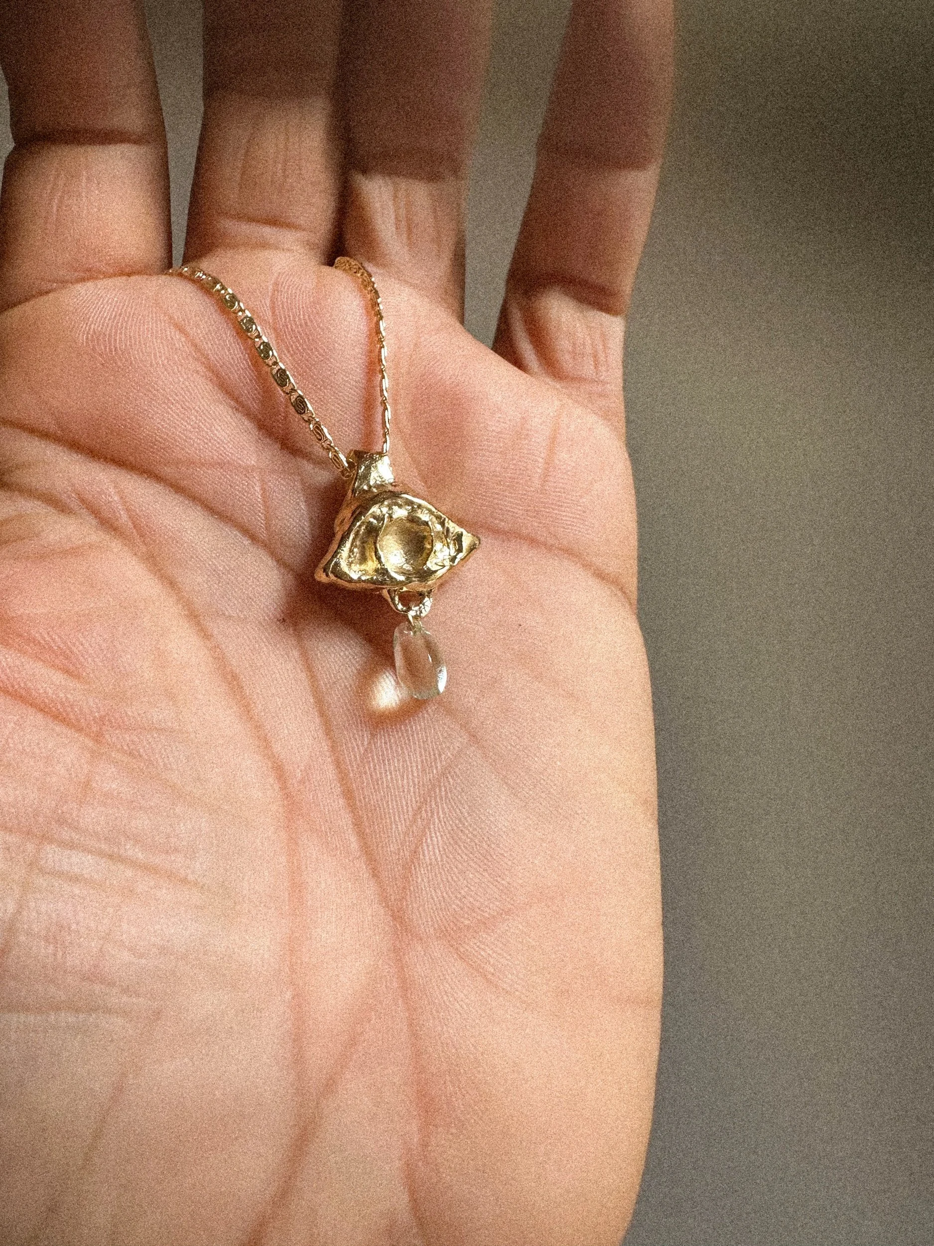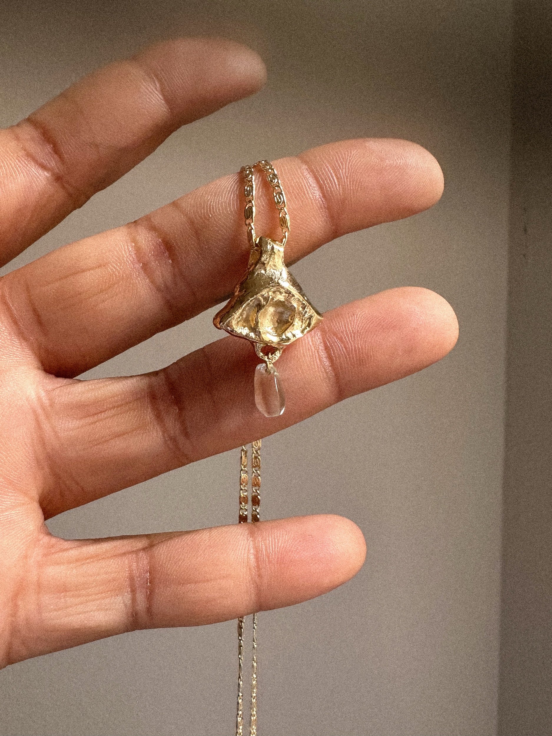 hangs from an 18" 14k gold plated stainless steel valentino chain, characterized by unique interlocking design, which blends the sleek, flat links of a curb chain with the uniformity of an anchor chain.