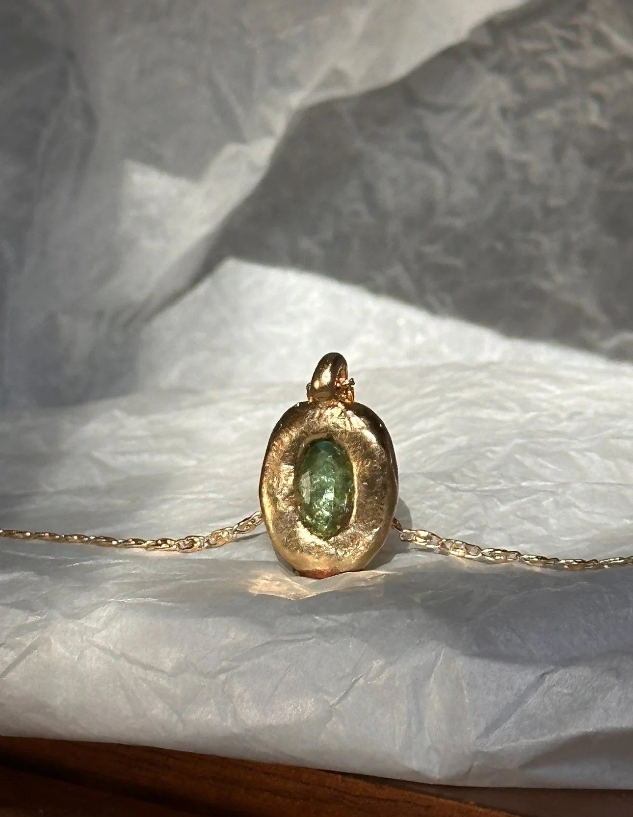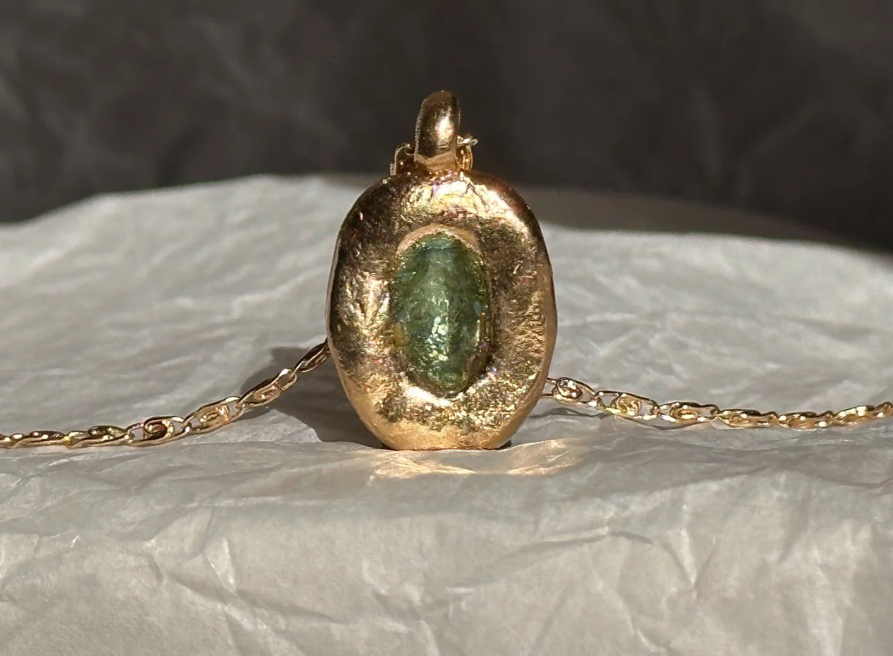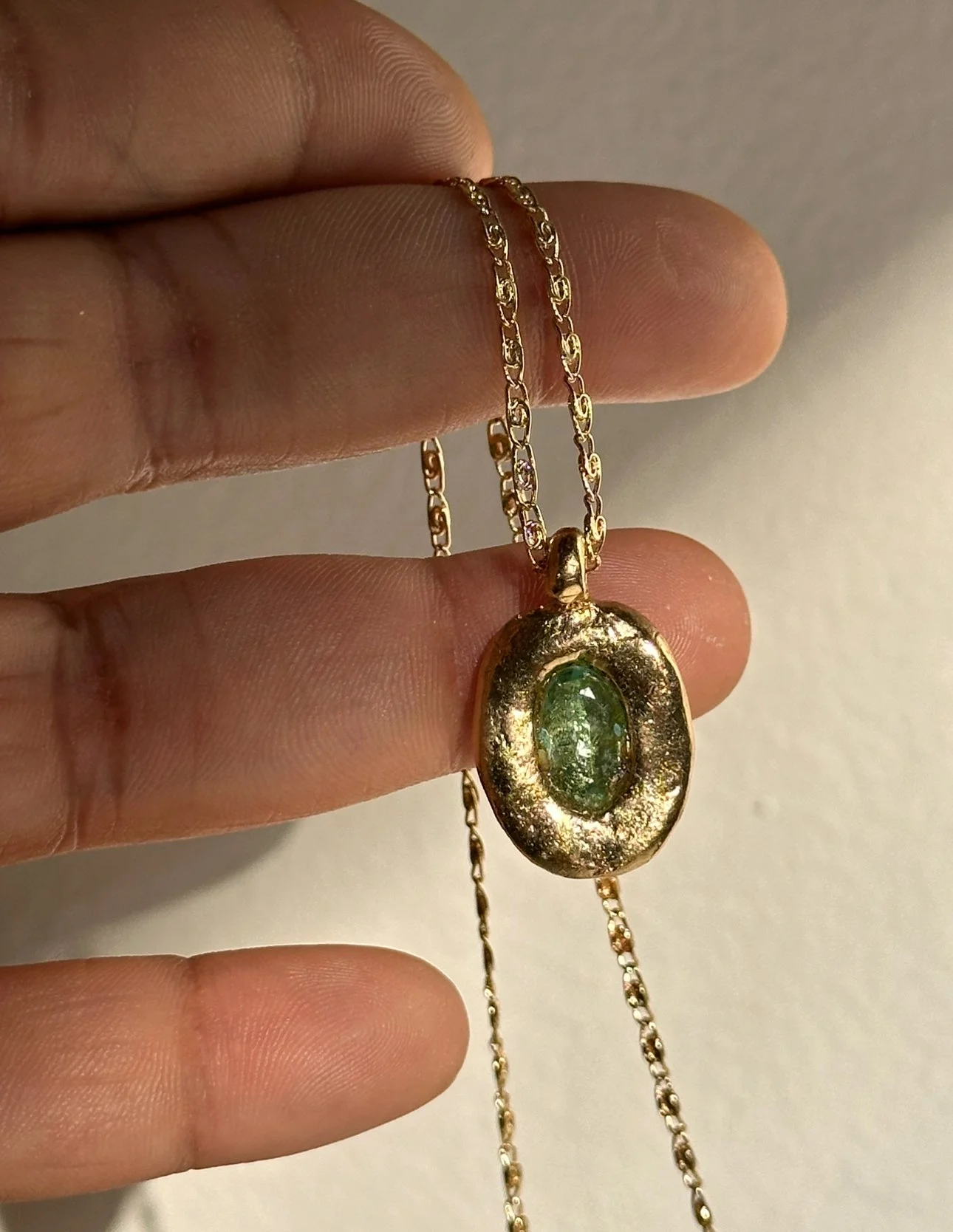 hangs from an 18" 14k gold plated stainless steel valentino chain, characterized by unique interlocking design, which blends the sleek, flat links of a curb chain with the uniformity of an anchor chain.