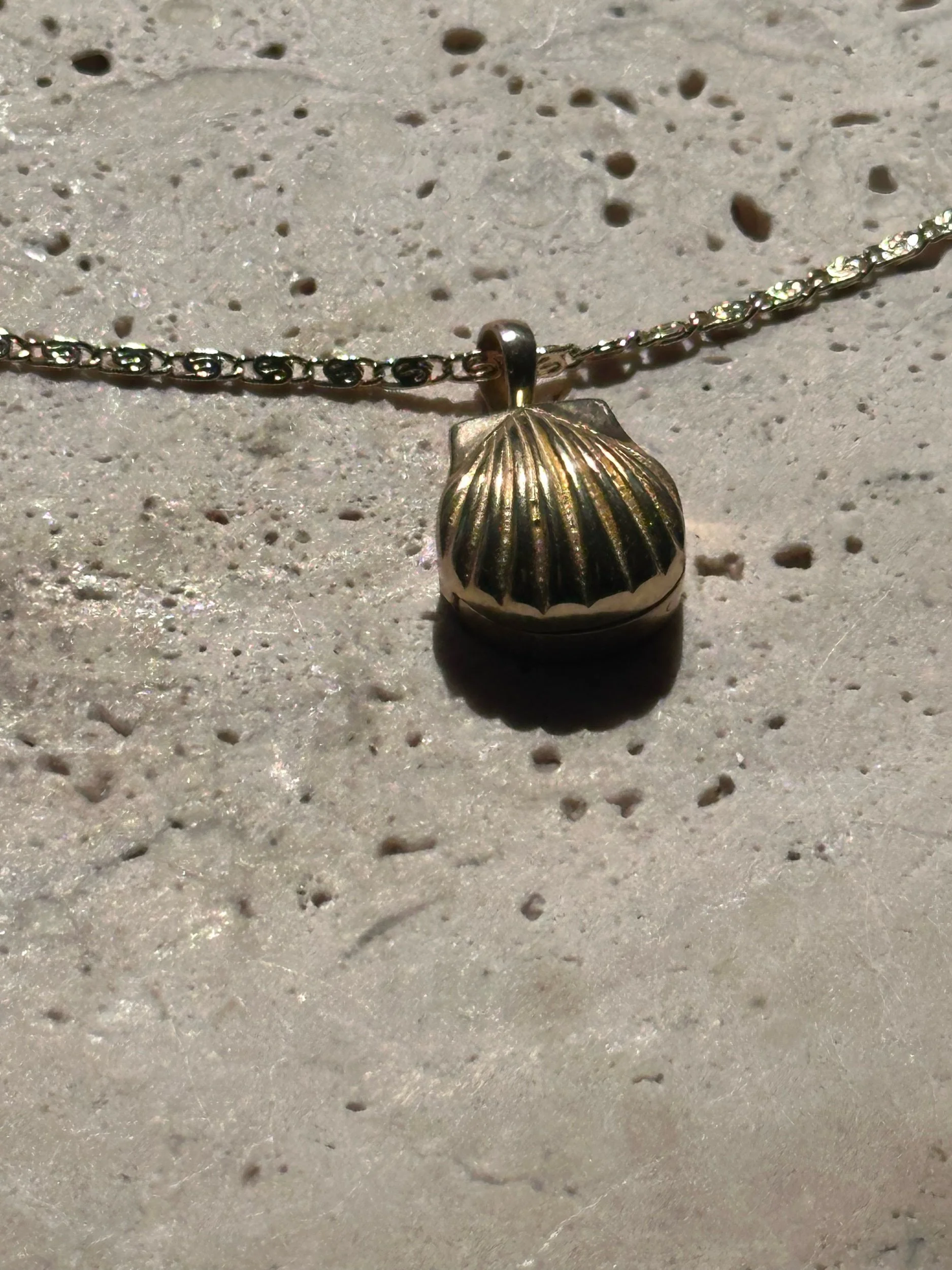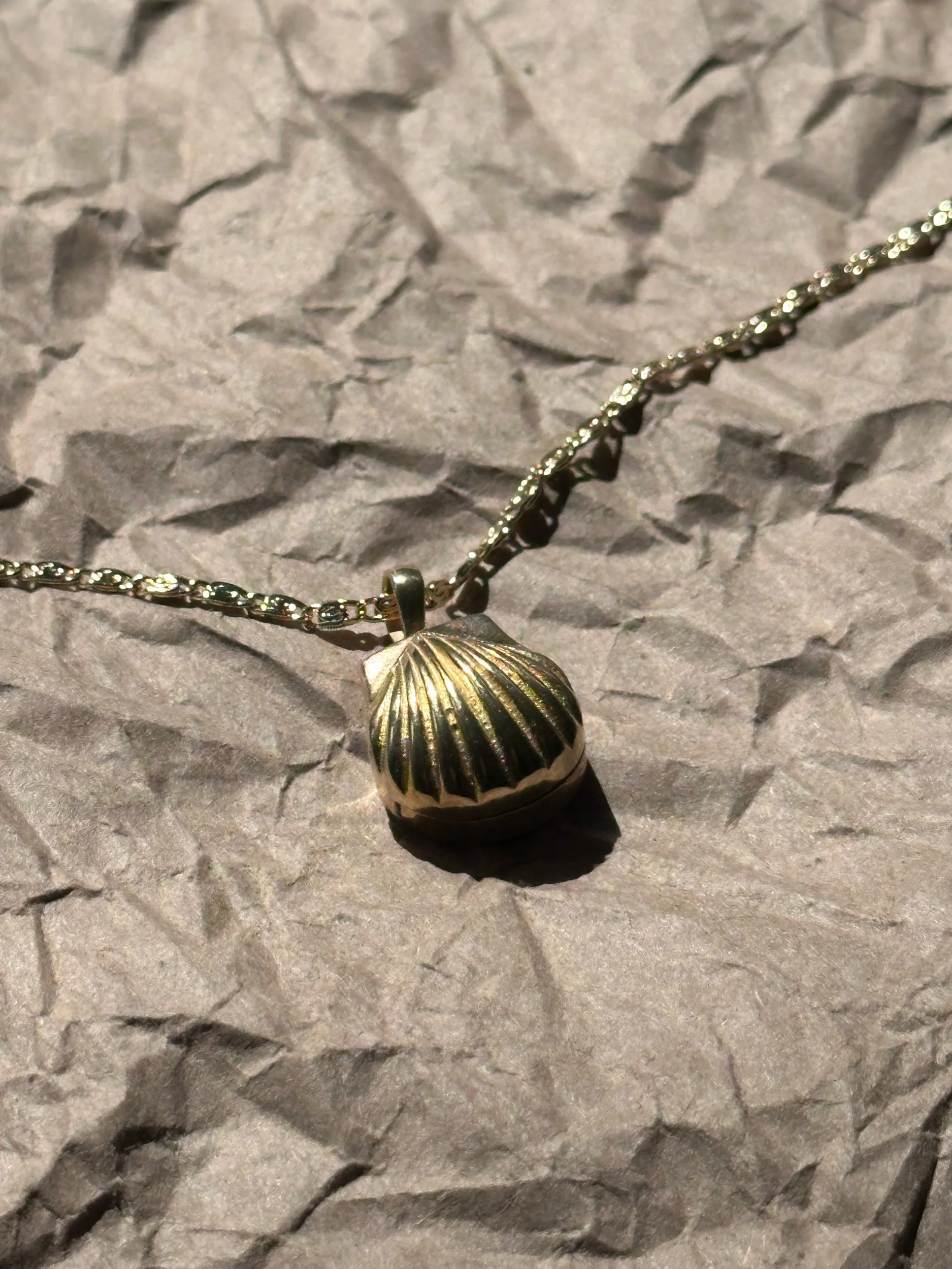A small, sculptural hand carved shell locket vessel designed to hold a trace of something meaningful.