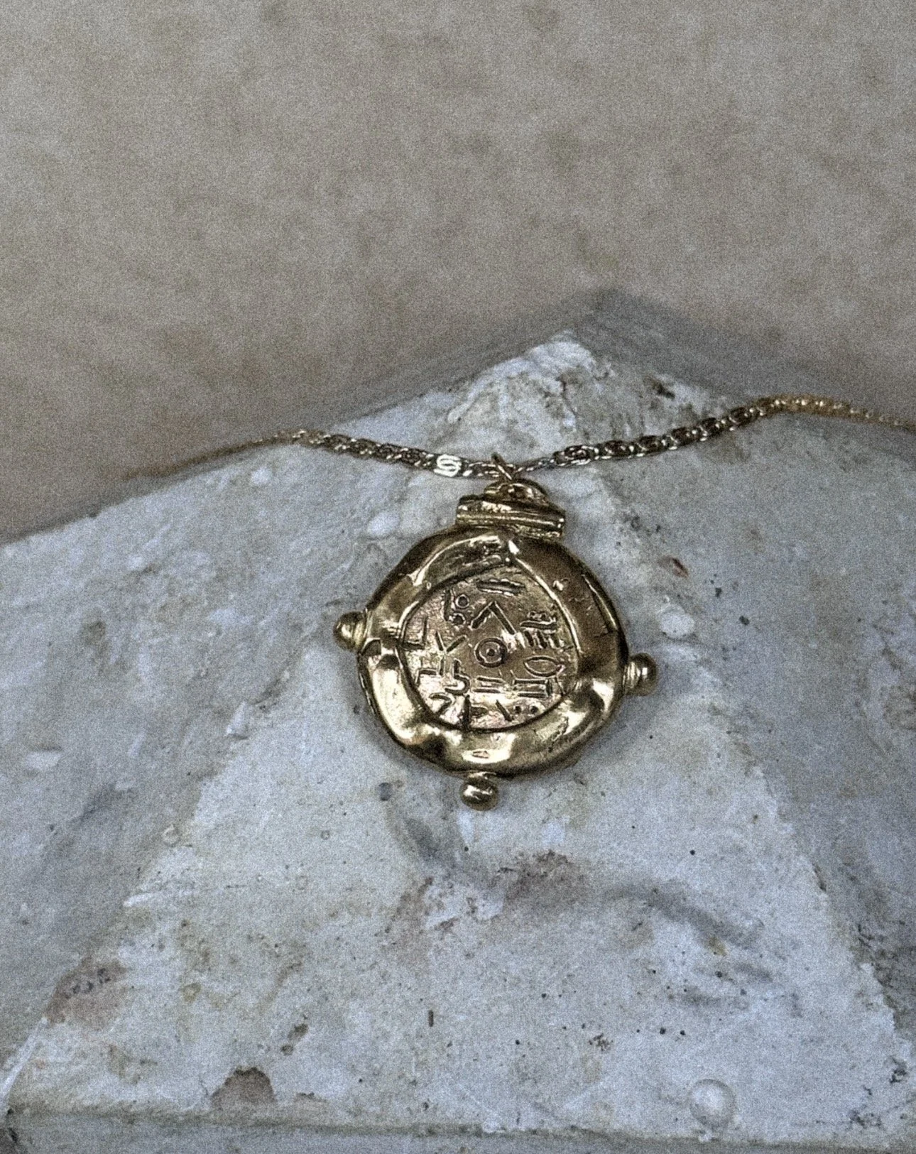 hangs from an 18" Gold plated stainless steel link chain.
